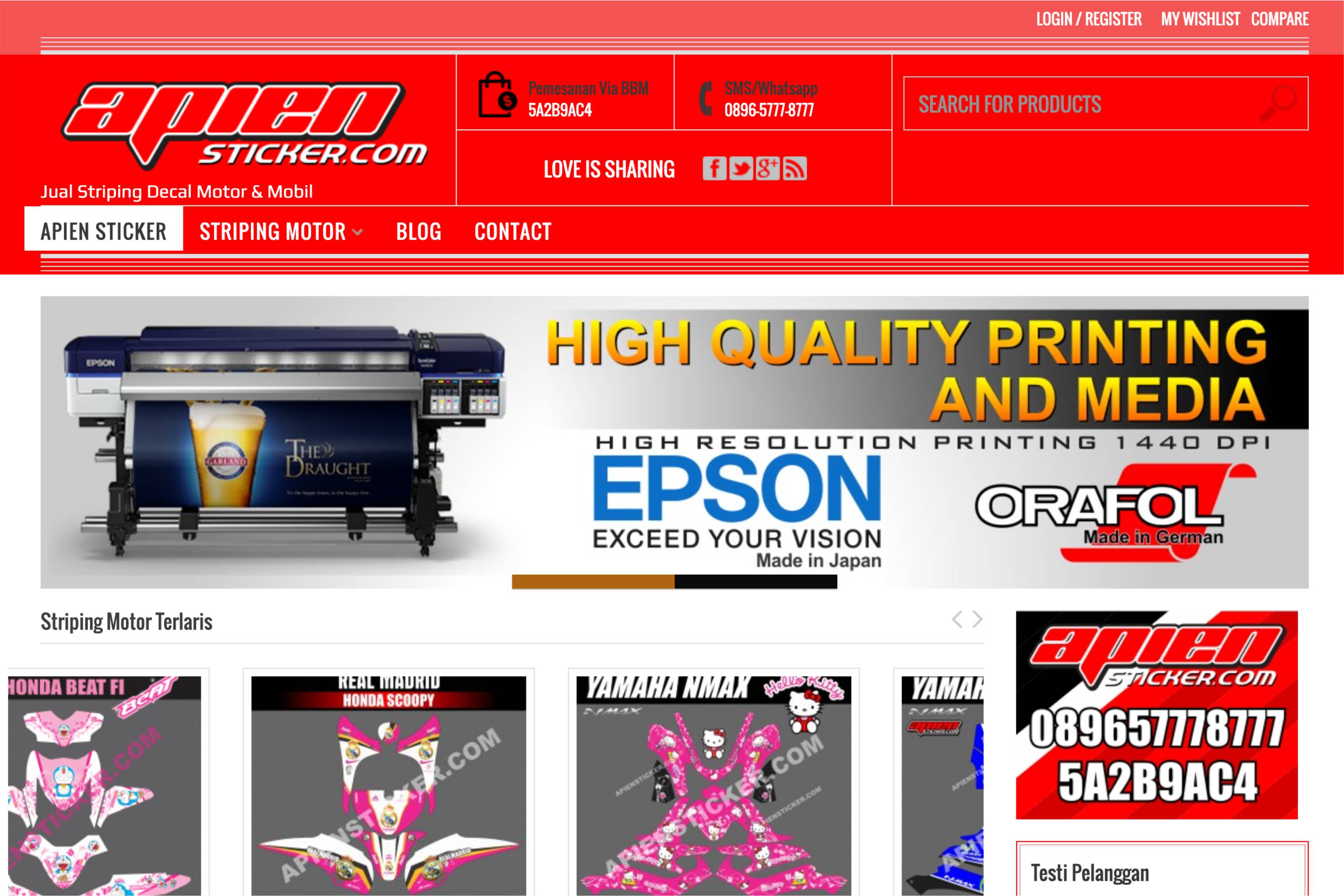 Sebuah perusahaan yang berfokus pada penyediaan layanan custom sticker berkualitas tinggi untuk kendaraan bermotor dan mobil. Dengan pengalaman yang mendalam dalam desain dan aplikasi stiker khusus. Apien Sticker menjadi pilihan utama untuk personalisasi kendaraan yang unik dan profesional.
