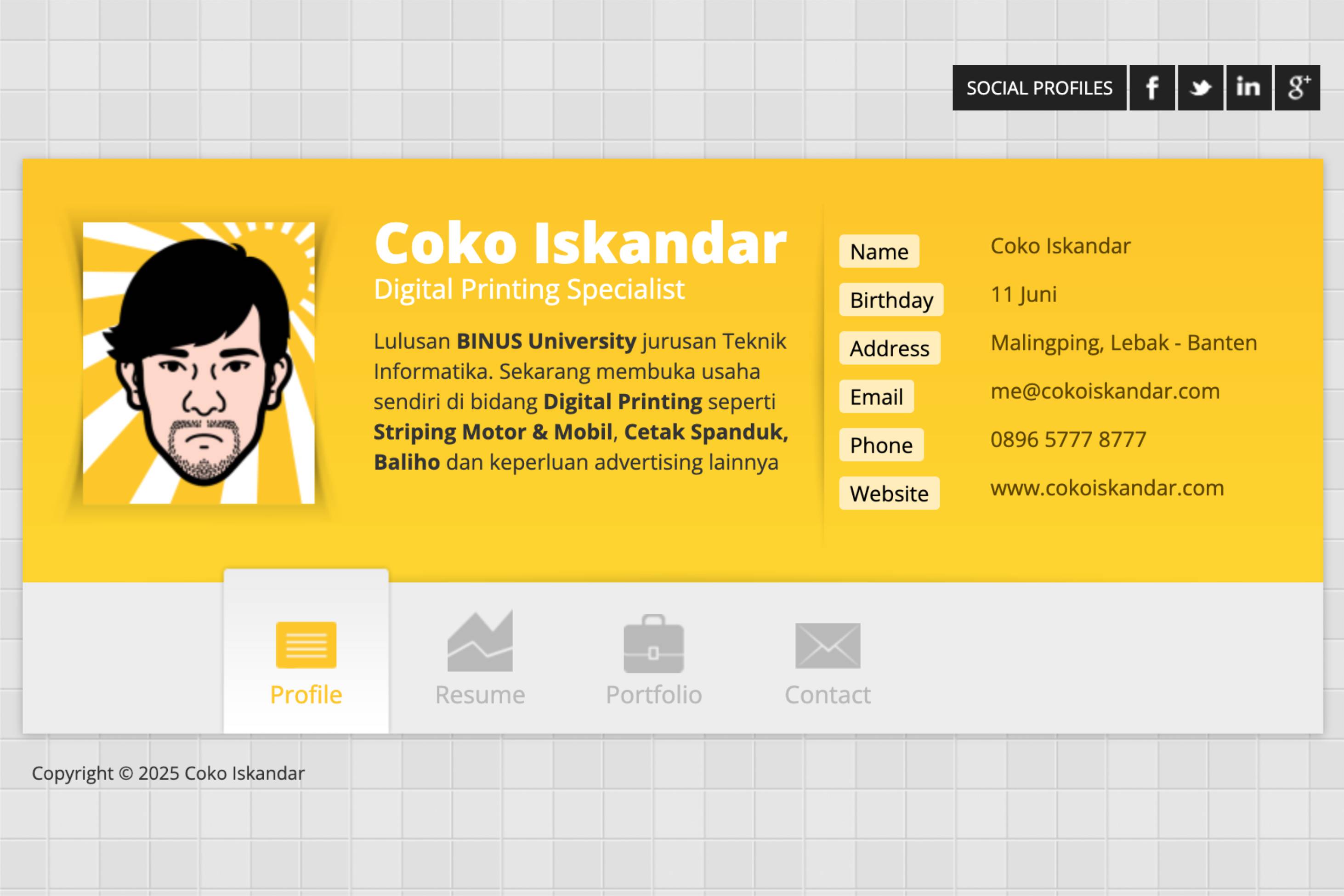 Lulusan BINUS University jurusan Teknik Informatika. Sekarang membuka usaha sendiri di bidang Digital Printing seperti Striping Motor & Mobil, Cetak Spanduk, Baliho dan keperluan advertising lainnya
